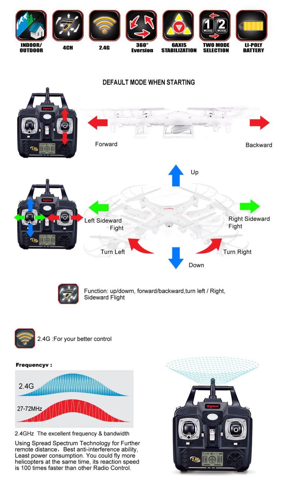 Function:up/down,left/right sideward fight,forward/backward,turn left/right,with gyro/flash lights,A 360-degree 3D and special functions(continuous rolling)